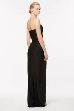 With a slim fitting bodice and flowing maxi length skirt, the Asymmetrical Games Strapless Gown is perfect for your next black tie event. Featuring an asymmetric waistline with an alluring front side slit for ease of movement. The floor length gown is detailed with internal boning in the bodice to create a flattering and fitted look. Cut in a medium weight viscose blend with a subtle stretch. Style Number: 52011.BLK