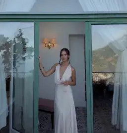 The Charmed Cowl Slip Dress features a deep cowl neckline and plunging back, with crossed back straps and a gold knot buckle for a refined touch. The maxi length and panelled skirt add dramatic flair, while the luxe satin fabric with a subtle sheen enhances its elegant appeal.