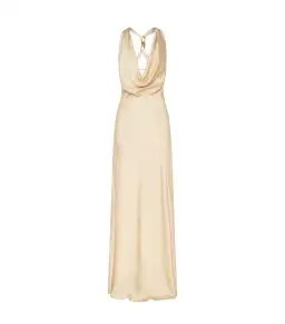 The Charmed Cowl Slip Dress features a deep cowl neckline and plunging back, with crossed back straps and a gold knot buckle for a refined touch. The maxi length and panelled skirt add dramatic flair, while the luxe satin fabric with a subtle sheen enhances its elegant appeal.