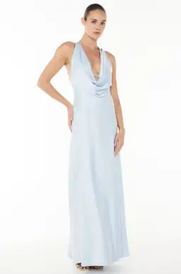 The Charmed Cowl Slip Dress features a deep cowl neckline and plunging back, with crossed back straps and a gold knot buckle for a refined touch. The maxi length and panelled skirt add dramatic flair, while the luxe satin fabric with a subtle sheen enhances its elegant appeal.