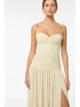 Make a stylish statement at your next event in the Double Time Pleat Dress. The dress features elegant pleats throughout and considered boning through the corset top and flows into a beautiful maxi skirt with a subtle split.
