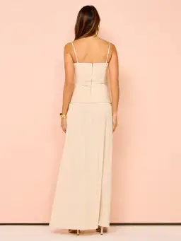 Make a stylish statement at your next event in the Double Time Pleat Dress. The dress features elegant pleats throughout and considered boning through the corset top and flows into a beautiful maxi skirt with a subtle split.