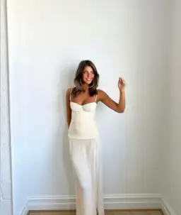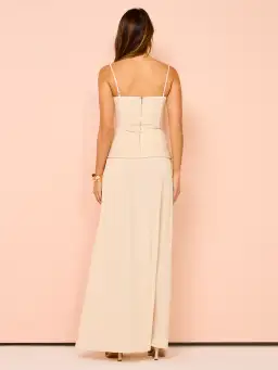The dress features elegant pleats throughout and considered boning through the corset top and flows into a beautiful maxi skirt with a subtle split.