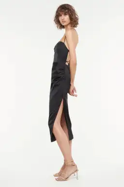 The Miami Heat Backless Dress is crafted from a stretch viscose for ease of wear, featuring a soft draped ruched skirt and detailed with an alluring side seam split. The dress is finished with fine self-rouleau straps that crossover at the open back.
