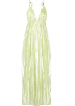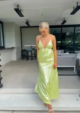 Crafted from a luxurious metallic silk blend, this relaxed A-line maxi slips on with ease. Featuring delicate spaghetti tie straps, V neckline with ruched bust detailing and small cutout and a statement open low back. Adored for it's energizing lime green hue, girls will be wearing this silhouette for long lunches, twilight cocktails and balmy summer dinners