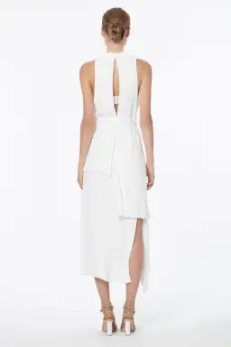Made with modern fabrication of viscose crepe, this midi length dress features a plunging neckline balanced with a matte surface texture. A waist tie pulls the figure in before flowing out into a tiered skirt adds dimension and free movement to this soft structured dress of fluidity. Finished with a cut out back detail and a side split hem creating a delicate feminine look. Rent this gorgeous dress for a romantic weekend getaway or a day at the races!