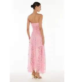 Make an elegant statement this spring with the Tea Ceremony Maxi Dress. This strapless gown is crafted from a corded lace adorned with meticulously crafted floral appliqué motifs. Maxi in length, it features a curved hem and a back zip closure, epitomising elegance for spring events.