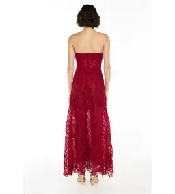 Make an elegant statement this spring with the Tea Ceremony Maxi Dress. This strapless gown is crafted from a corded lace adorned with meticulously crafted floral appliqué motifs. Maxi in length, it features a curved hem and a back zip closure, epitomising elegance for spring events.
