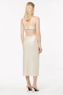 Crafted from a metallic mesh weave, the Total Eclipse Cut Out Dress is bound to turn heads this party season. The midi length dress features a semi-detached top and skirt to create a striking open back. Detailed with a centre bust cut-out to flatter and accentuate the bust. Detailed with a dual gold hook and eye for closure and centre back invisible zip on the skirt.