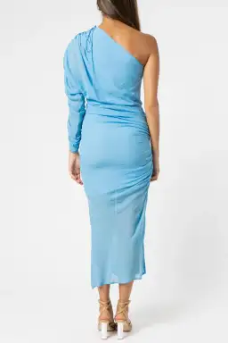 with a slim-fitting silhouette, The Zero Gravity Dress by Manning Cartell is defined by intricate ruched detailing along the sleeve and hip and features a side split secured with invisible zip fastening.