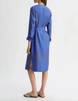 The Martina Midi Dress by Willow is a clean shift silhouette crafted from smooth and soft silk twill, rendered in a bold blue print designed in-house. A detachable self-belt allows for optional waist definition, while the midi length and slightly cropped sleeve make it a chic and versatile addition to any wardrobe.