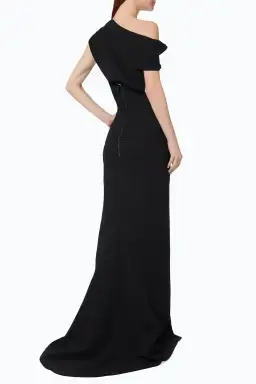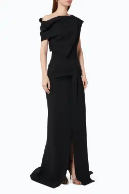 This design blends sculptural draping with a modern romance. The integrated bodice creates an ultra-flattering shape, while the draped fabric at the hip gently cascades to conceal and reveal a thigh-high split.