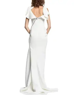 Crew neckline with modern structural draping on the shoulders that trails to an open back, coupled with a high slit and a statement gunmetal zip.