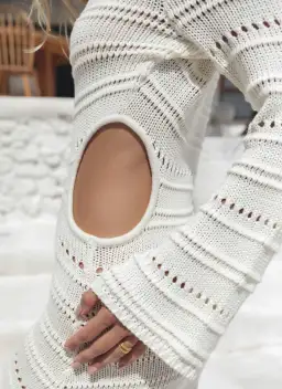 "The Nobody But You Dress is made from lightweight knitting textured with raised ribbing and tiny perforation throughout. It has a semi-sheer finish, making it a great option for a coverup. Spin and reveal cut outs either side of the waistline."