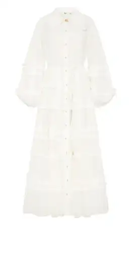 Cascading tiered frills and blouson sleeves are met with a classic collar, functional centre front button closure and a rouleau waist tie for a custom fit. A maxi length skirt and shirt silhouette completes this relaxed yet elevated statement piece.