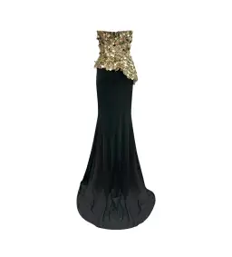 U-shaped bustier with a soft peplum fullness. Fully boned with an underwire support, with a fit and flared jersey skirt. Invisible zipper fastening on the centre back. Mirrored metallic sequin-embellished tulle foundation with a stretch quality to mould around the body.