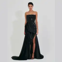 Strapless gown with a curved sculptured front skirt detail with a split. Fully lined and boned bodice. Featuring sequin embellished foundation. Invisible zipper fastening on the centre back.