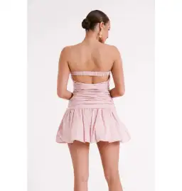 The FRAN is a strapless mini dress with a drop waist, low back, and bubble hemline. The ruched bodice and side seams paired with its bodycon fit highlight the body’s natural curves. An invisible side seam zipper ensures a smooth, seamless silhouette while an elasticated fabric strap across the upper back ensures a comfortable, secure fit.
