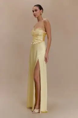 The LARISSA Satin Maxi Dress with Ruched Petals is a breathtaking piece designed to make a statement. Featuring a flattering strapless neckline, this dress showcases rounded pleated panelling details on the bodice, adding a touch of sophistication and texture. The centre back zip closure ensures a secure fit, while the straight skirt shape creates a sleek silhouette. A daring front leg split adds an element of allure, perfect for showing off your favourite heels. Lined for comfort and a luxurious feel, this dress is your go-to choice for special occasions, ensuring you’ll turn heads wherever you go.
