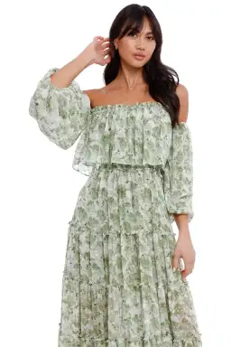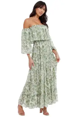 The Misa LA Cassandra Dress is a dreamy off-shoulder maxi for bohemian style lovers. Made from soft chiffon, it boasts 3/4 balloon sleeves, a tiered skirt with ruffle details, and a shirred bodice with a ruffle overlay.