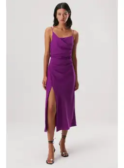 The Alden Midi Dress adopts a flowing silhouette, complimented by a draped, asymmetric front and split. Rendered in our lightweight Paris Satin fabrication, Alden is perfect for your next special occasion.