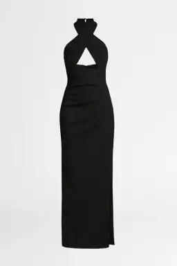 Fall in love with the Atta Dress in Black by Misha. This maxi dress boasts an enticing halter neckline, a waist cutout, and a side split. Ideal for renting for wedding celebrations and formal events, it also features an invisible back center zip for a seamless look.