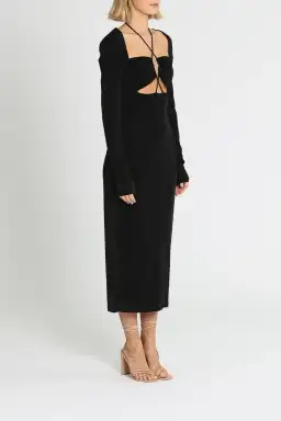 For a stylish and modern look, the Blaire Dress in Black by Misha is your go-to choice. With a halter neckline that crosses over and ties at the back neck, this dress falls to a midi length. It also features a cutout bodice, long sleeves, and a bodycon fit, making it perfect to rent for a cocktail party or evening event.