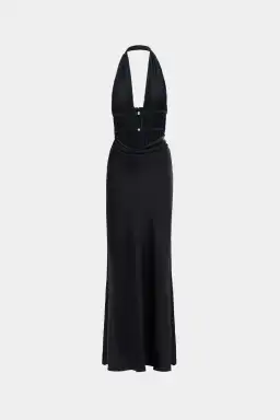 The Celine Dress features a low plunge halter neckline that beautifully accentuates the décolletage, complemented by an open, low back for a captivating look. Underbust binds adorned with gunmetal clasps and the mesh gathered bodice exudes an effortless elegance. The style boast a bias-cut skirt that drapes gracefully, enhancing the silhouette.