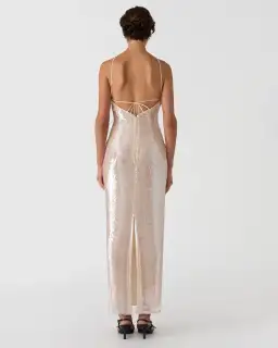 The Allegra Maxi Dress boasts a slim-fit skirt that gracefully skims the body, complemented by a maxi length of 100cm from the waist and a center back split at the calves for ease of movement. The open back with tie-up detail adds an alluring element, while the invisible center back zipper ensures a seamless and flattering fit. Fully lined for comfort, this gown is the epitome of glamour and style.