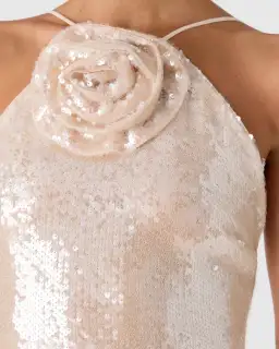Introducing the Allegra, a stunning high-neck sequin gown designed to captivate at any special occasion. This dress features a halter neckline adorned with a center rosette detail.