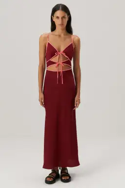 Cut it out in Ramira. Crafted with contrast signature MISHA piping detail, this maxi dress elevates your day or night occasions, through a fishtail silhouette skirt and triangular cut-outs at the waist with rouleau ties at the centre front.