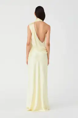 Introducing the Constantina. Crafted from our signature MISHA satin fabrication, this gown exudes effortless elegance with a high neckline and flowing side split.