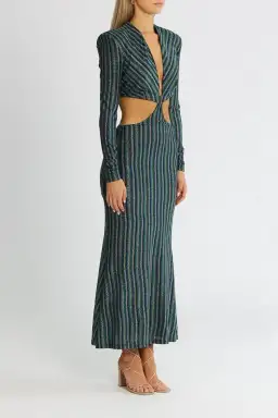 Crafted from a stunning blue and green striped metallic spandex, this dress features a plunging neckline, and daring waist cutouts that separate the back bodice and skirt, and is finished with a soft fishtail hem. Perfect to hire for cocktail party or night out.