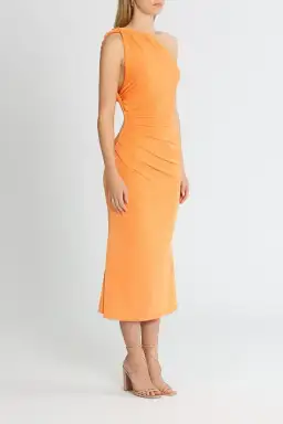 Command attention at the event with the stunning Dune Dress by Misha. Crafted from a sleek fabric, it showcases a twisted one-shoulder design, waist gathering, and a graceful midi-length hemline. This dress is an ideal choice for renting at your next daytime occasion. The dress highlights a one-shoulder neckline, a midi length, and gathering details on the bodice.