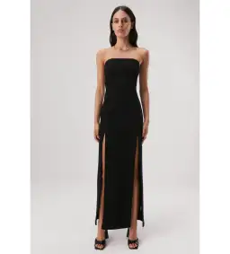 Midi-LBD with sheer panelling along the side of the bodice and two striking front splits at the front.
