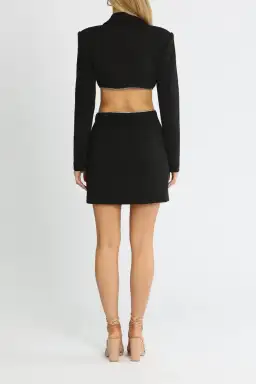 The Fay Bonded Crepe Dress by Misha is a must-have for this season's parties. Its tailored blazer silhouette, adorned with a diamante trim, creates an edgy look. This mini dress comes with double-breasted buttons and stylish cutouts from the waist to the back, making it perfect for a night out or any party. With a mini length and a collared neckline, it's both chic and trendy.
