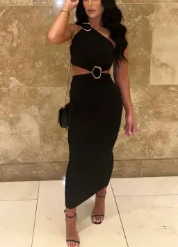 Sway the night away in the Klara Slinky Jersey Midi Dress. Adopting a slim silhouette and detailed with gold metal accents, Klara is our Misha pick for your next special occasion.