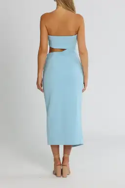 Experience a transformation with the captivating Powder Blue Medora Dress by Misha. Fashioned from bonded crepe, this dress showcases a strapless neckline, a mock wrap style with a leg split, and a unique asymmetric waist cut-out. Make a lasting impact by renting this exceptional dress, perfect for a cocktail party or daytime occasion. It's strapless, midi-length design with a waist cutout ensures a chic statement.