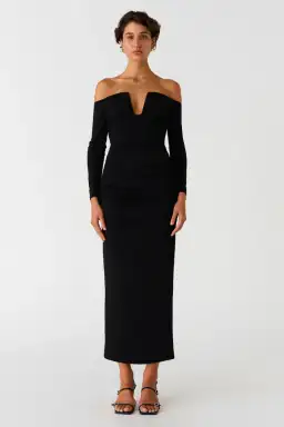A sophisticated and refined take on an off-the-shoulder silhouette. Raelynn highlights the decolletage and cleavage, creating a sensual allure. This is balanced by the longer-line skirt and long-sleeve detail. Pair Raelynn with a pointed toe pump or strappy sandal to complete the look. The perfect dress for any evening event.