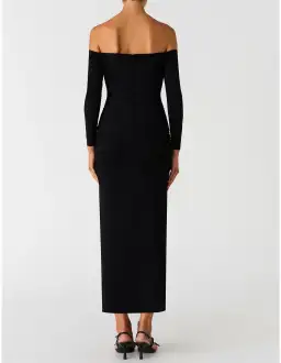 A sophisticated and refined take on an off-the-shoulder silhouette. Raelynn highlights the decolletage and cleavage, creating a sensual allure. This is balanced by the longer-line skirt and long-sleeve detail. Pair Raelynn with a pointed toe pump or strappy sandal to complete the look.