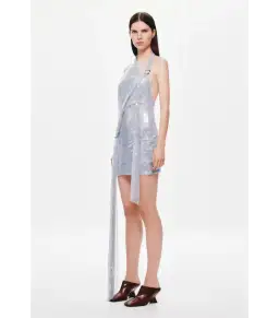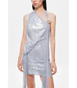 An all-over sequin cocktail dress with an easy fit and assymetrical neckline. The sequin style is accented by unique metal ring hardware at both the hip and décolletage which hold waterfall sash detailing.