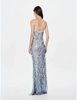 Cut in a floor-length silhouette, this sequin-embellished gown shimmers with every step, reflecting light like rippling water. A plunging neckline and daring low back add a sultry edge, while its sleek finish ensures timeless sophistication. Pair with delicate heels and minimal accessories for an effortlessly radiant look.