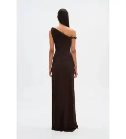 The 'Sisal' Mesh Maxi Dress in Espresso, an effortless, yet sexy draped silhouette that skims the body.
