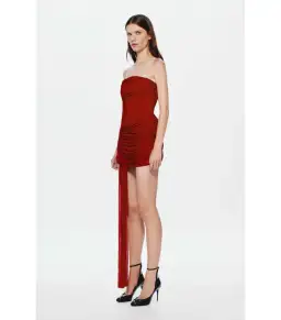 Gossamer stocking jersey delicately pleated and pulled around the body. A strapless cocktail silhouette that boasts a dramatic floor-length sash.