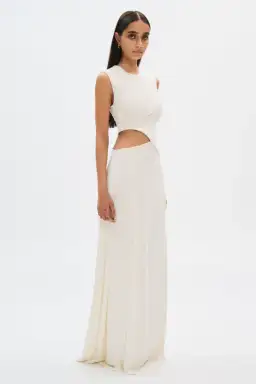 The 'Sierra' Cupro Maxi Dress in Ivory, featuring hand-twisted cords that contour the bust and waist-line.