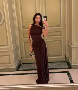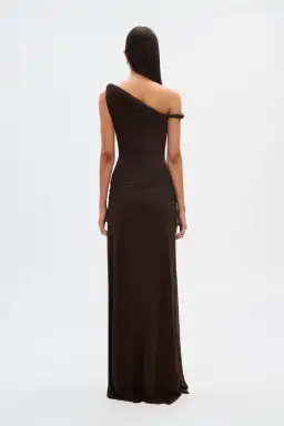 The 'Sisal' Mesh Maxi Dress in Espresso, an effortless, yet sexy draped silhouette that skims the body.
