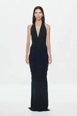 A plunging neckline dress crafted from cupro jersey. The fabrication is ruched up the front and back of the garment, creating delicate drapery. The garment is finished with a halter neck.