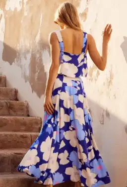 The Betsy Set by Mister Zimi In Blue Camellia has you covered thanks to her ever-so-fun vibe. Made from a Viscose Crepe EcoVero Blend, the fabric is light and flowy. The length of the straps is adjustable