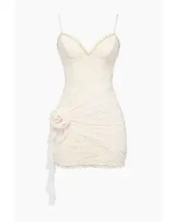 The romantic feel of our cream mini dress is defined by the prettiest details. Beautifully cut from stretch corded lace and backed in our figure cinching power mesh to perfectly cinch the fit, it has a sweetheart neckline edged with a gorgeous gold crystal trim and adjustable straps. We especially love the chic mesh overlay and flower embellishment for an ultra feminine vibe. It zips to the side for easy on.