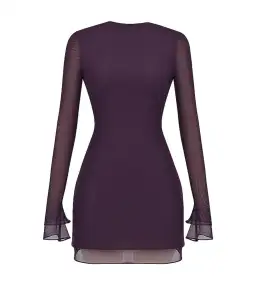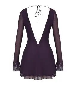 This pretty mini dress is cut from soft stretch mesh in a gorgeous shadow hue and has a straight neckline that turns to tie at the neck, revealing a daring open back. It fits slim with a slight a-line shape layered skirt and the sleeves have fluted cuffs.